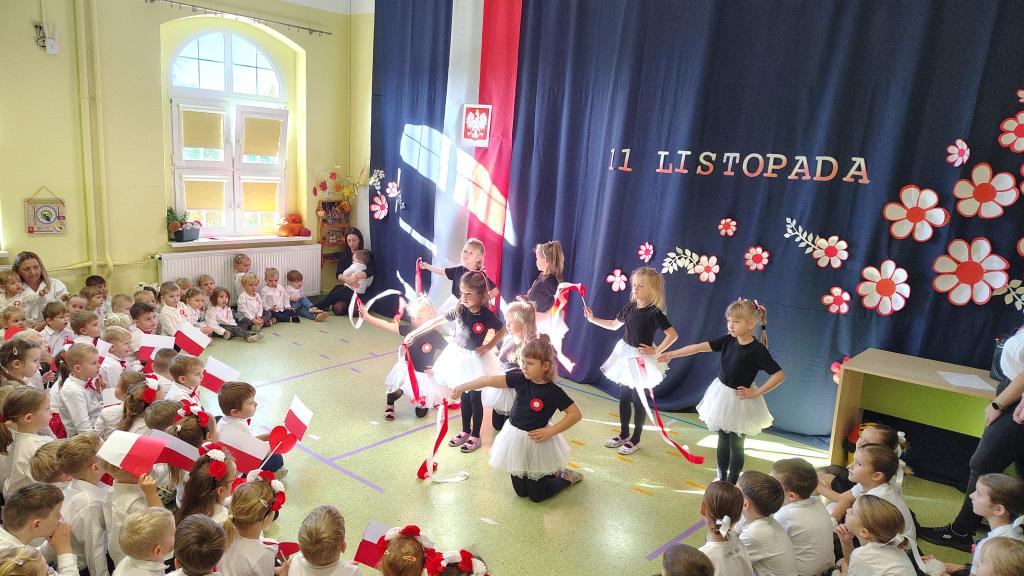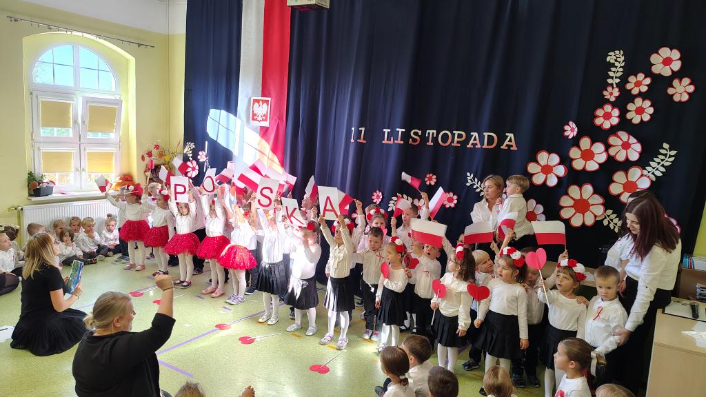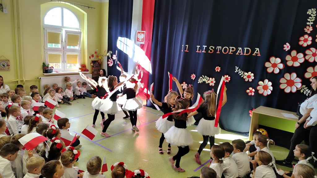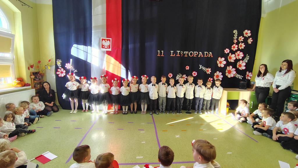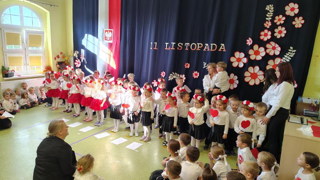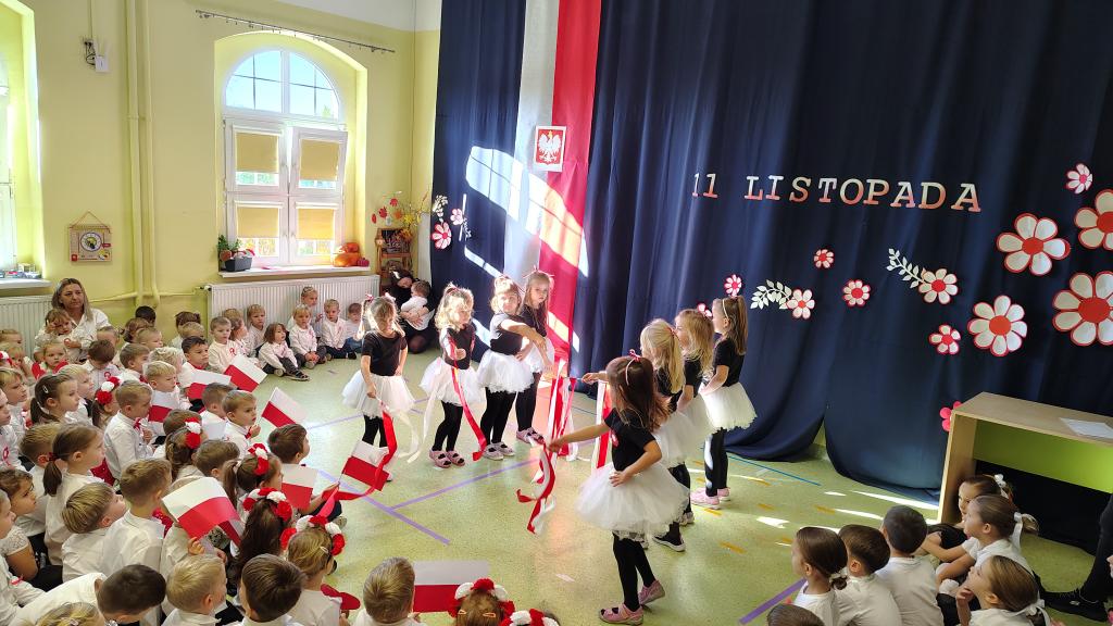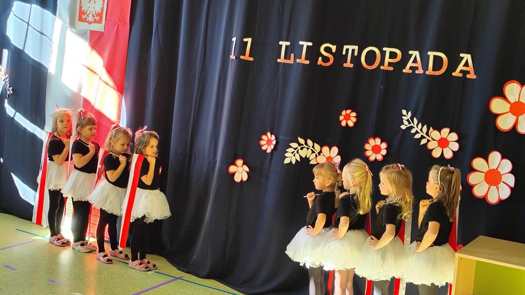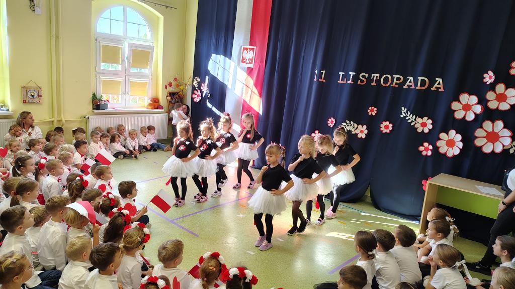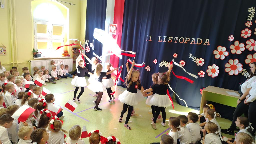 W naszym przedszkolu już od najmłodszych lat uczymy dzieci patriotyzmu, przywiązania do Ojczyzny,  wpajamy szacunek dla polskich symboli. Dlatego też do uroczystej akademii z okazji narodowego święta nasi mali podopieczni przygotowywali się już od tygodni. Wszystkie dzieci tego ważnego dnia wyglądały odświętnie i uroczyście, a na ich piersi widniały kotyliony w biało-czerwonych barwach. Przedszkolaki zaprezentowały piękny apel nawiązujący do obchodów 11 Listopada: były wzruszające deklamacje, tańce i pieśni patriotyczne. Mali artyści nagrodzeni zostali gromkimi brawami, a ich przygotowanie, zaangażowanie, postawa patriotyczna i artystyczny talent doceniony  został przez panią dyrektor Olgę Gruszczyńską.