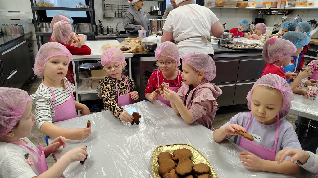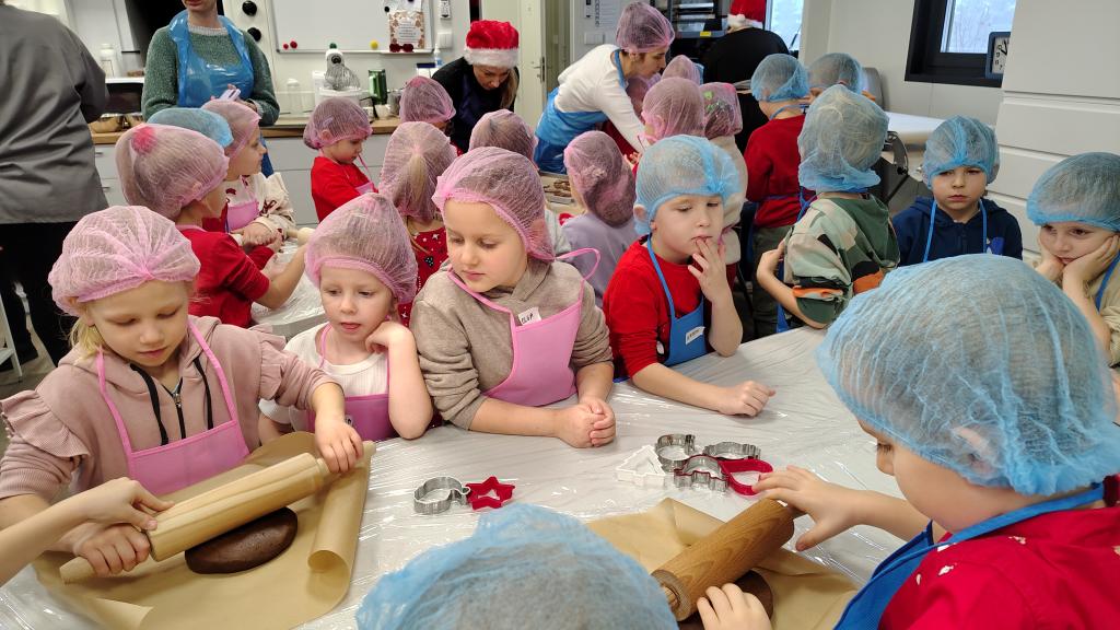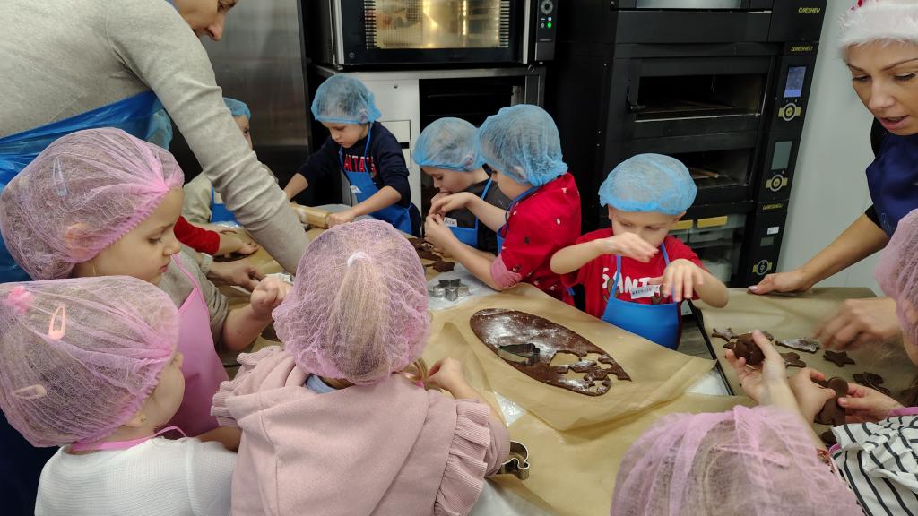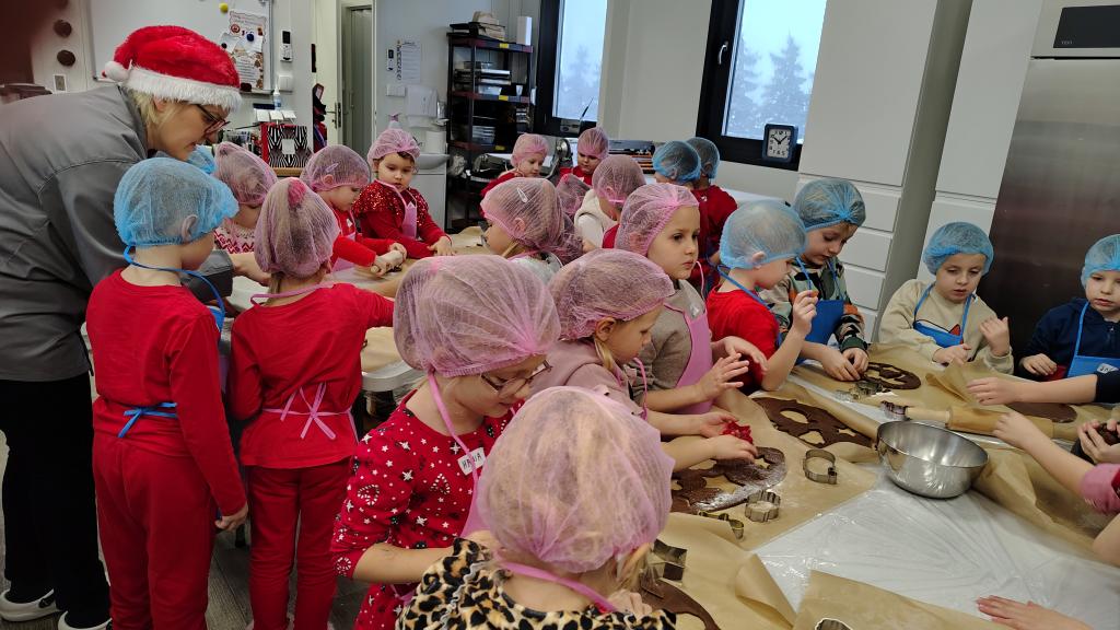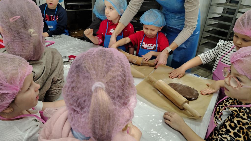 Pod czujnym okiem prowadzących maluchy poznały tajniki przygotowania tradycyjnego piernikowego ciasta. Każde dziecko mogło własnoręcznie ugniatać pachnącą masę, ucząc się cierpliwości i współpracy. Kiedy ciasto było gotowe, przedszkolaki z ogromnym entuzjazmem sięgnęły po foremki. Gwiazdki, serduszka, choinki i bałwanki – każdy piernik nabierał indywidualnego charakteru.