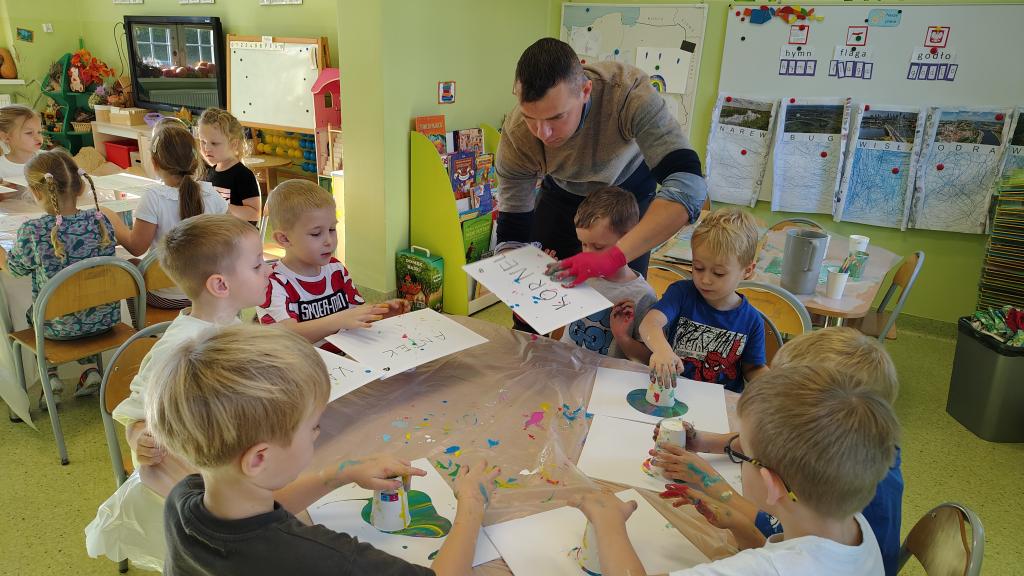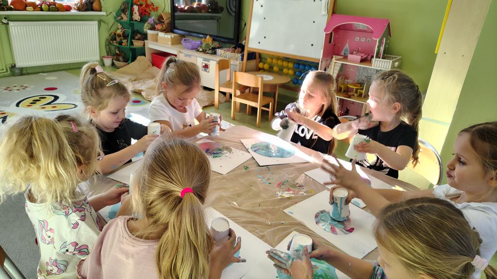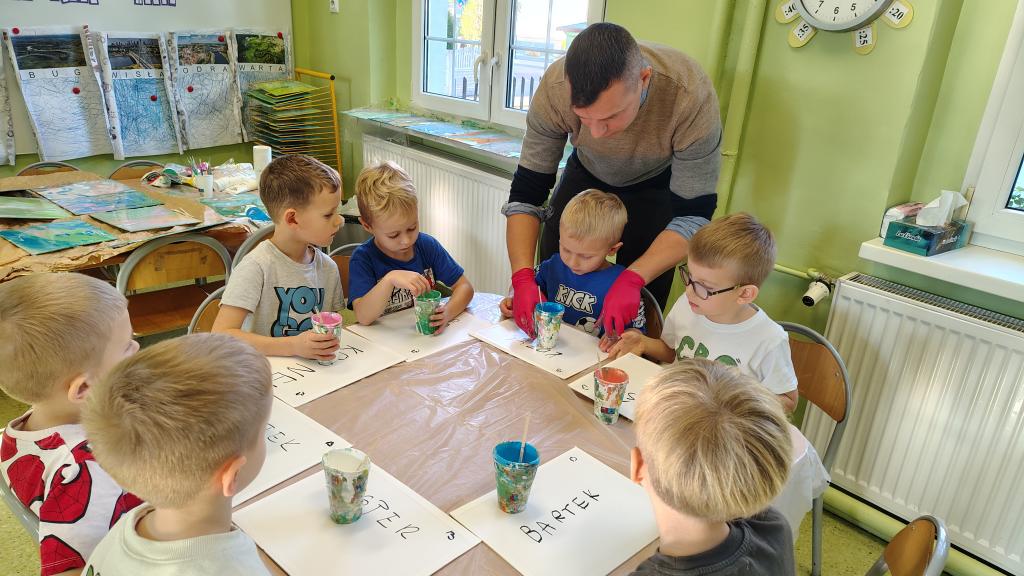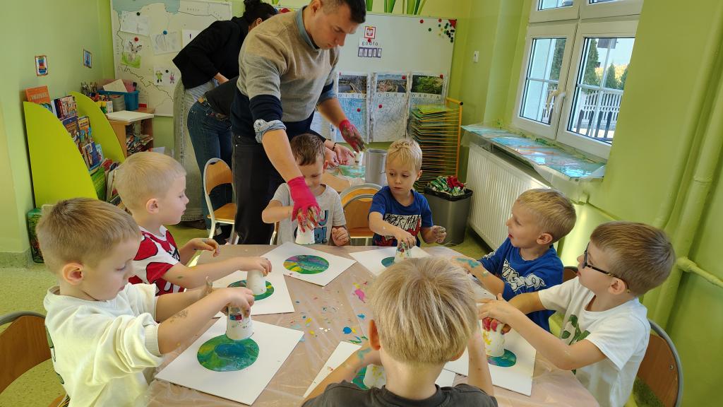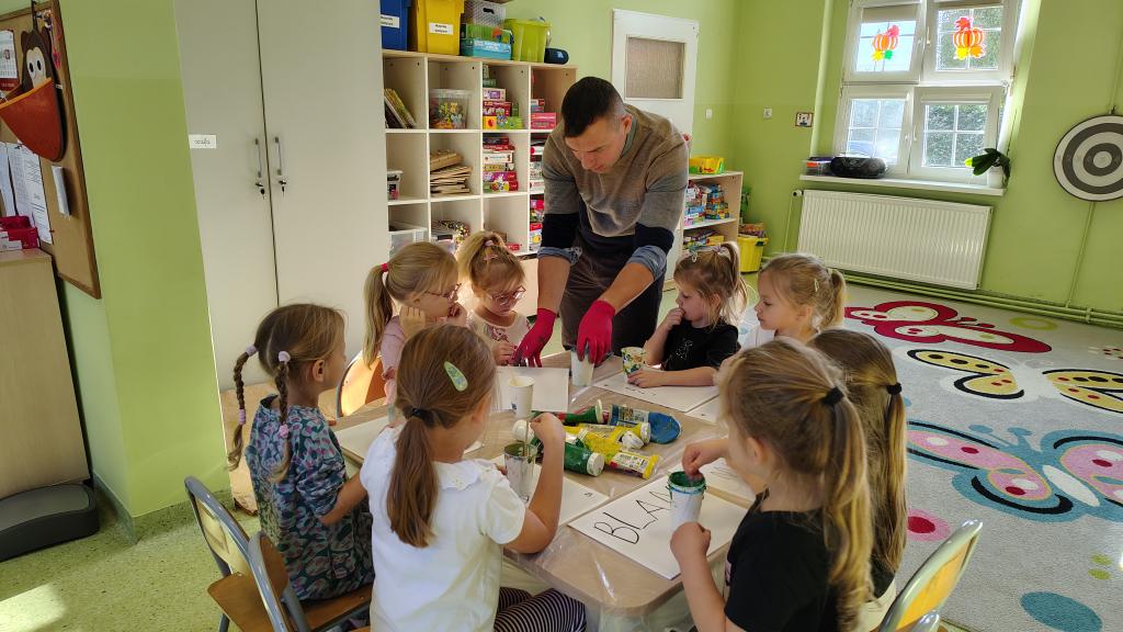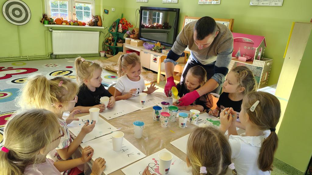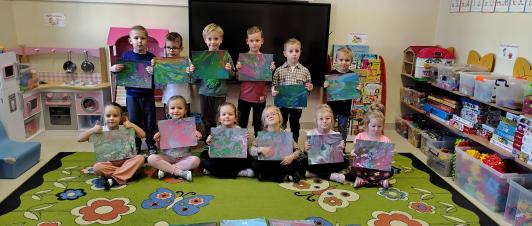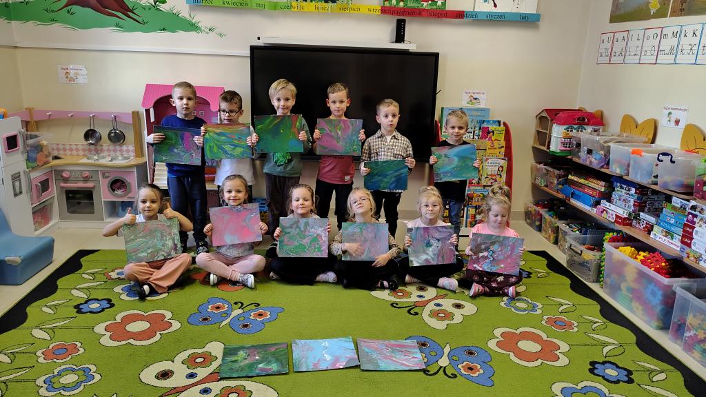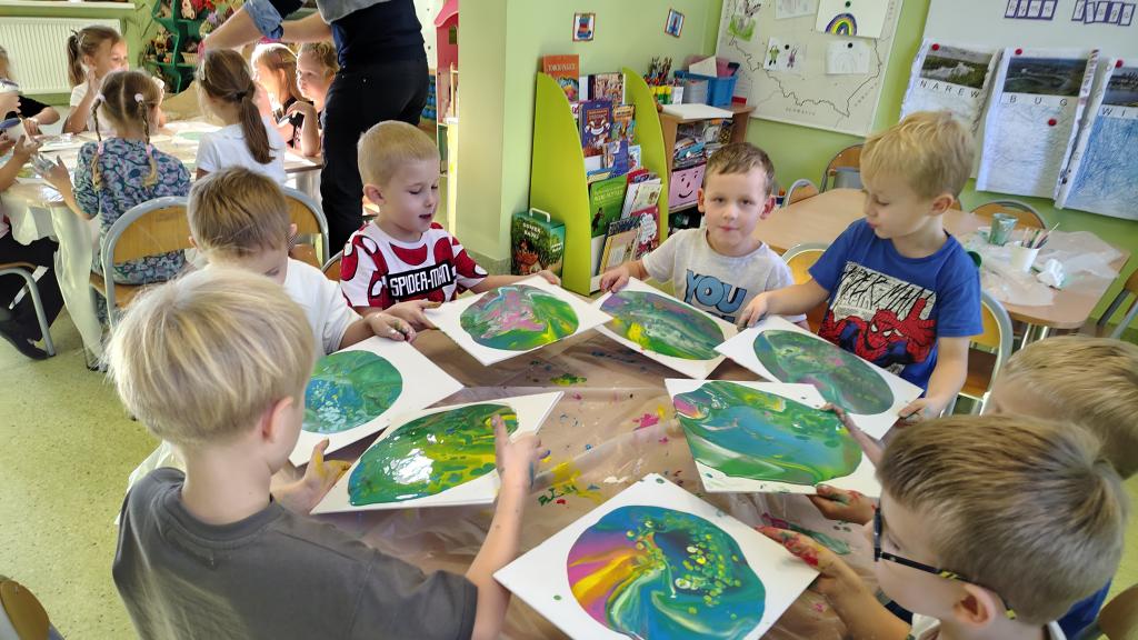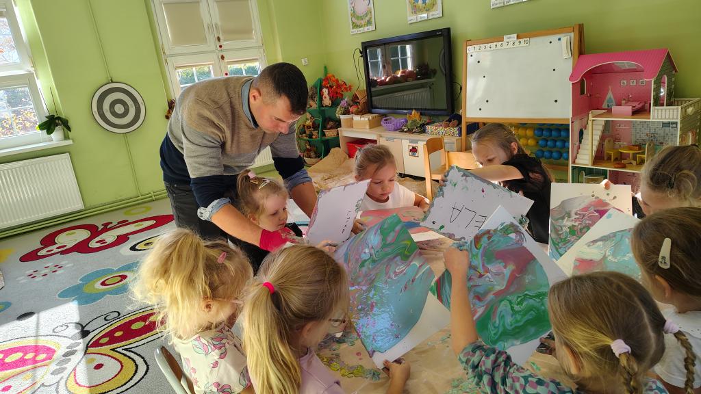 W piątek 7 listopada  nasze przedszkolaki wzięły udział w warsztatach malarskich, które przeprowadził pan Jakub Multan - kaliski malarz artysta. Nasz gość zapoznał dzieci z techniką malarską pouring. Warsztaty składały się z dwóch etapów: przygotowanie farb przy użyciu medium pouringowego, następnie tworzenie dzieła. Dzieci uważnie słuchały pana Jakuba, dokładnie wykonując jego polecenia. Podczas tworzenia prac malarskich przedszkolakom towarzyszyły niesamowite emocje. Jednak najwięcej radości dostarczył wszystkim efekt końcowy. Dzieła - obrazy małych artystów były naprawdę niesamowite!!!