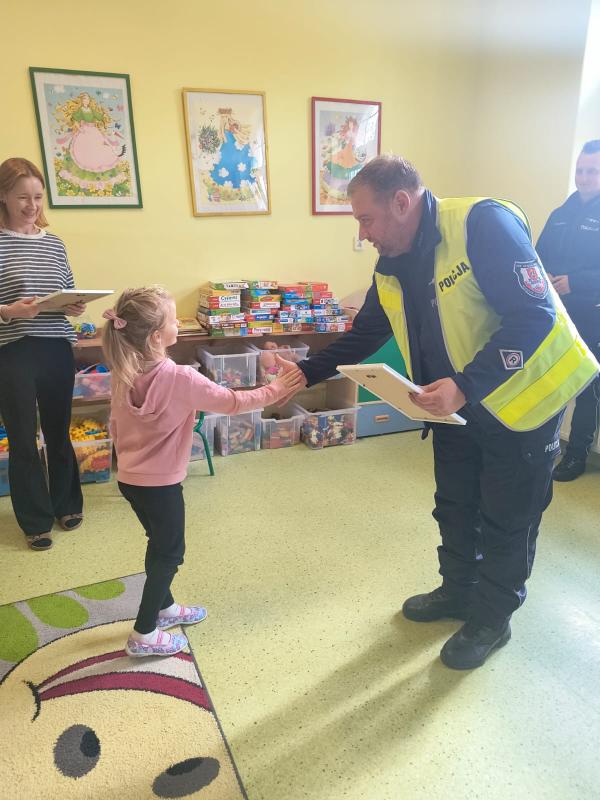 Na zakończenie spotkania dzieci otrzymały odblaski oraz pamiątkową pieczątkę. Nie zabrakło też wspólnych zdjęć i uśmiechów – atmosfera była pełna radości i ciekawości.